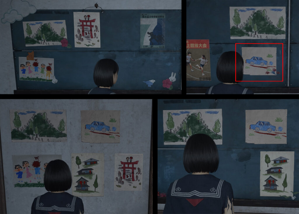 意味ありげな絵は「鳥居」「家」「山」「車」の4つで、唯一車の絵だけ、場所によってちょっと違う。