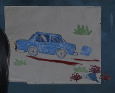 ここの車の絵だけ、雛子を表す折り紙?がひっくり返ったものと、赤い花が追加されている。。。
